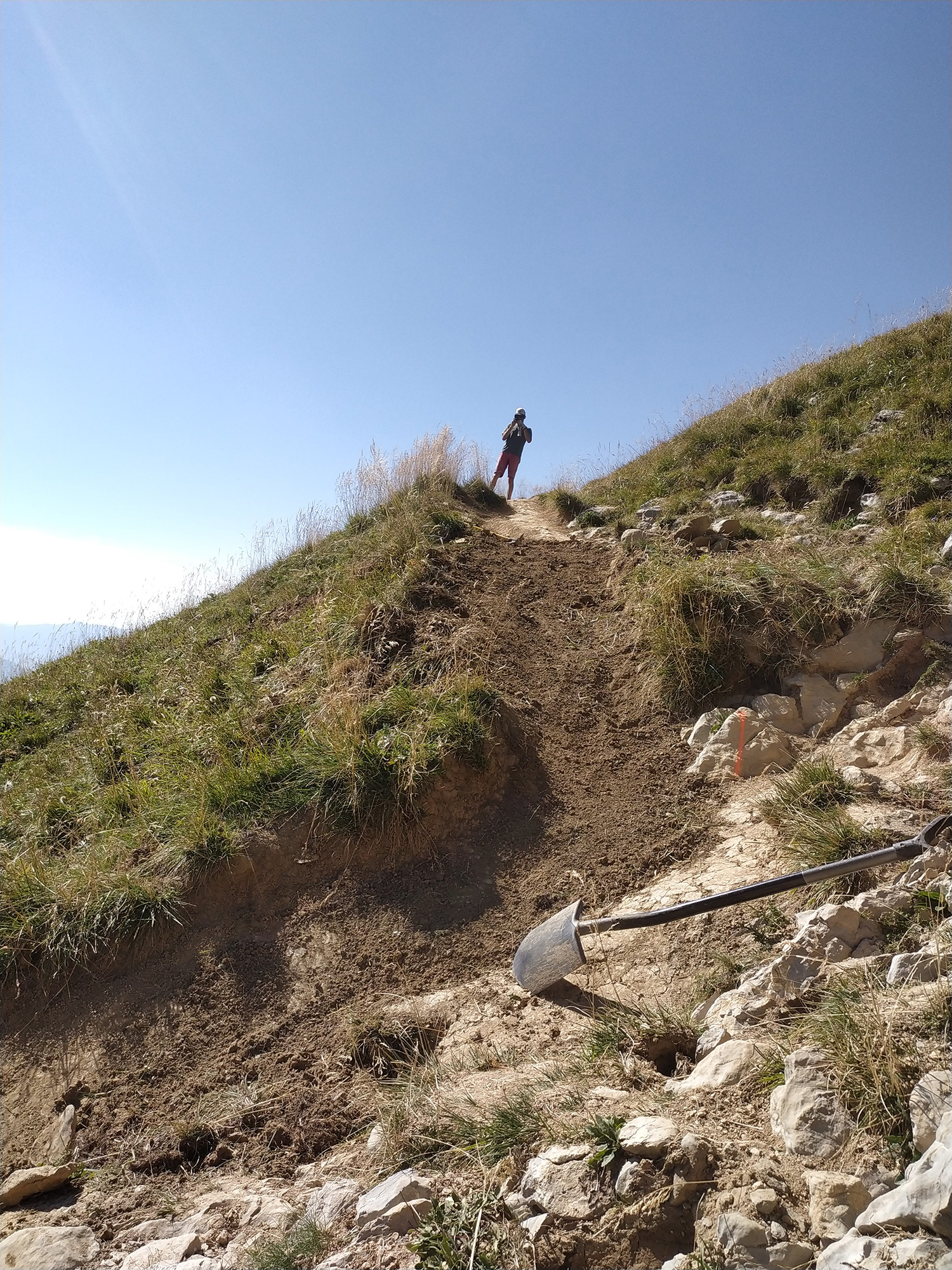 Partie alpage : Terrassement du cheminement principal à la pelle araignée, héliportage de terre végétale pour renaturation des sentes parasites.