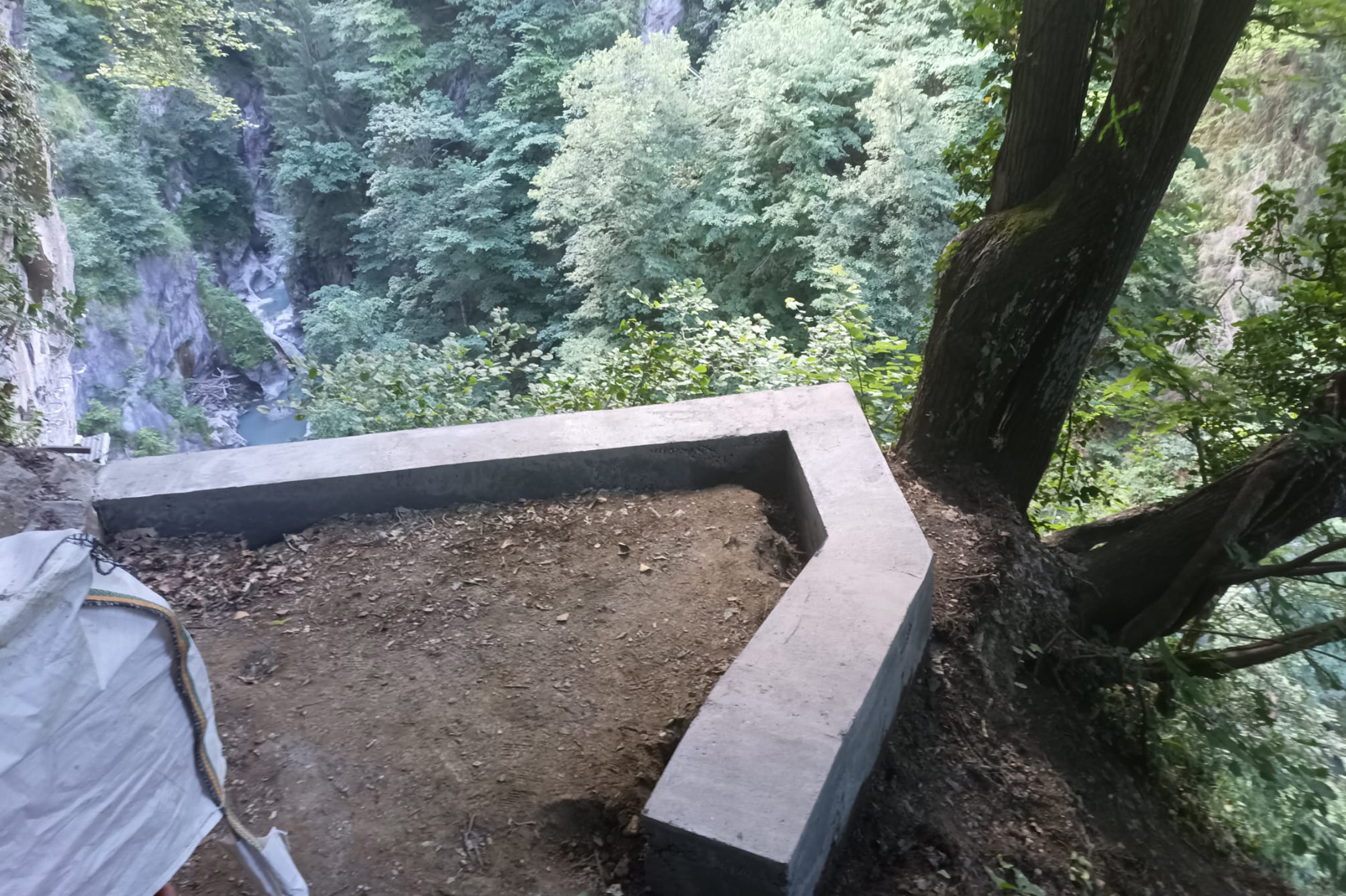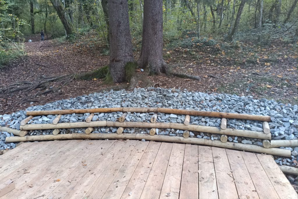 - Création d’un belvédère : confection d’une longrine béton coffrée, pose de garde-corps bois, pose de marches en bois, construction d’une barrière en rondins,